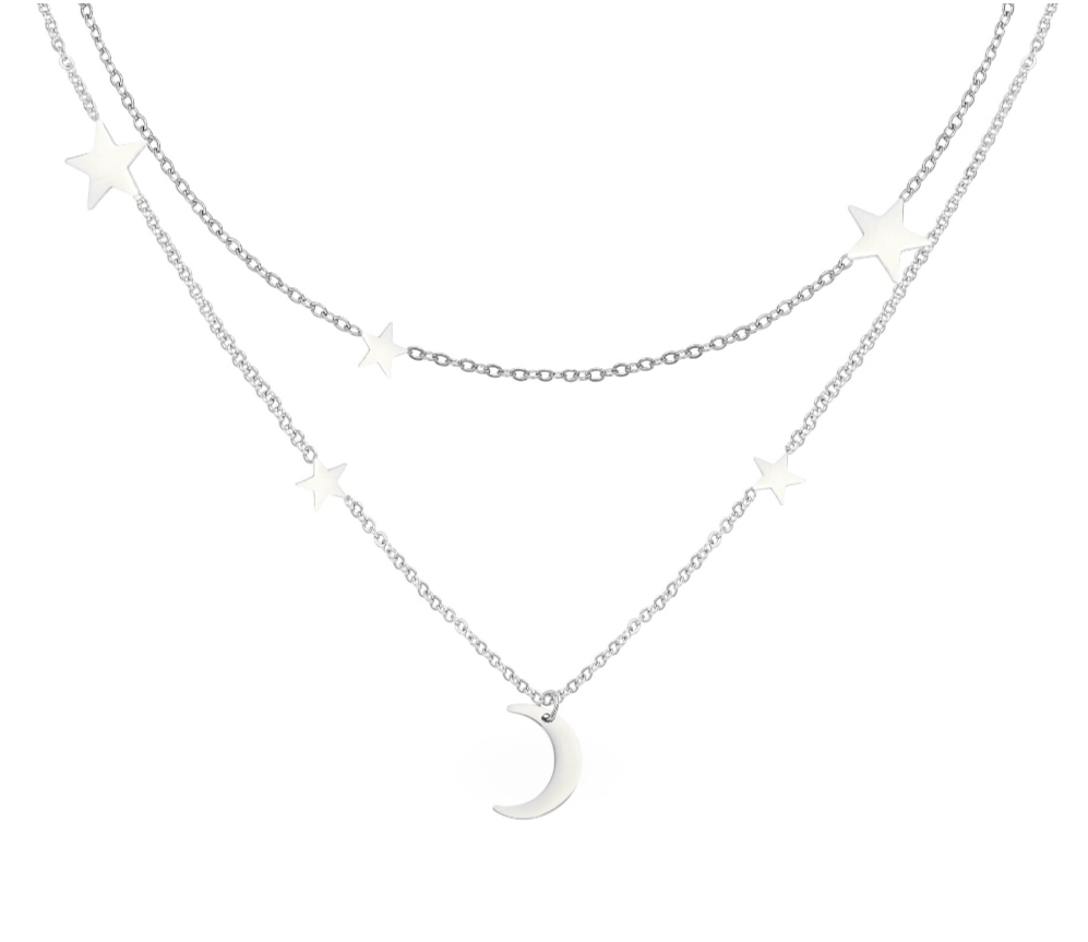 Mooie ketting van roestvrij staal met ster en maanvormige bedels.