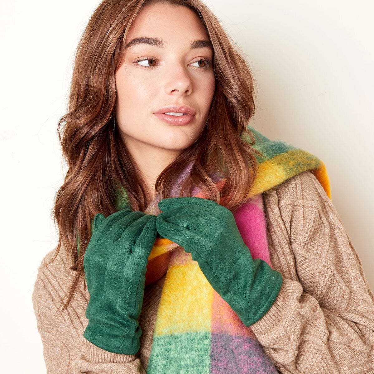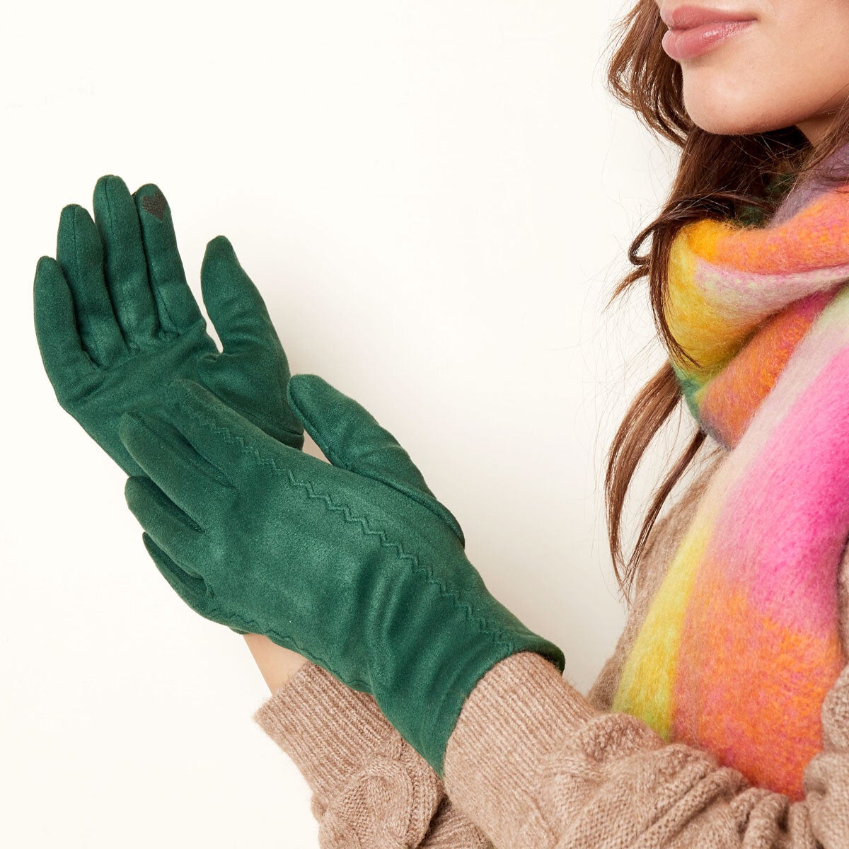 De handschoenen zijn verkrijgbaar in de kleuren zwart, beige, groen en oranje.